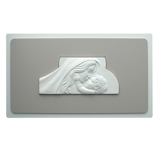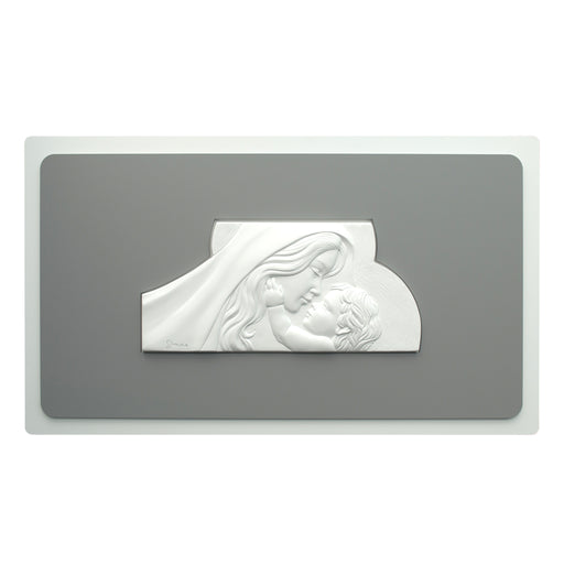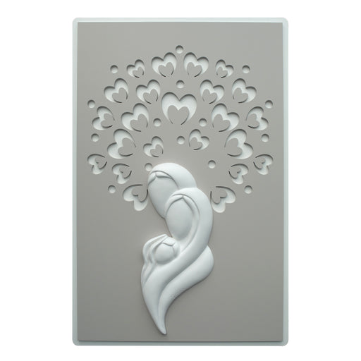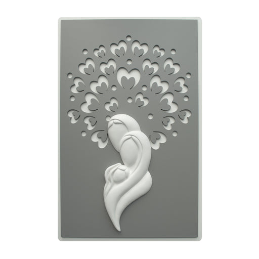 Visualizza tutti i dettagliPannello legno laccato base bianca con intaglio grigio e applicazione Maternità in polvere di marmo e resina bianca. dimensione: cm. 70x40 L'oggett...