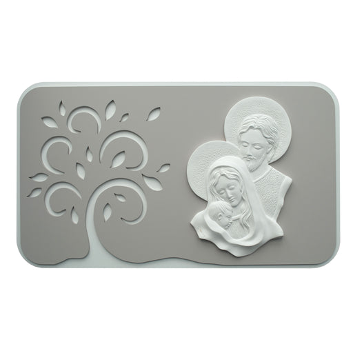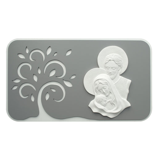 Visualizza tutti i dettagliPannello legno laccato base bianca con intaglio albero della vita grigio e applicazione Sacra famiglia in polvere di marmo e resina bianca. dimensi...