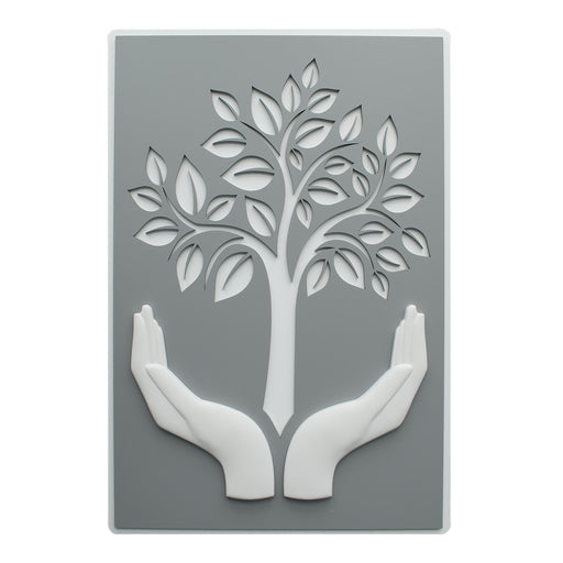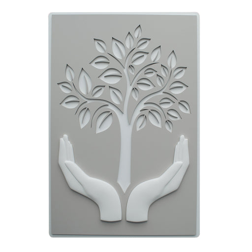 Visualizza tutti i dettagliPannello legno laccato base bianca con intaglio albero della vita grigio e applicazione e mani in polvere di marmo e resina bianca. dimensione: cm....