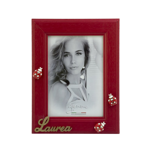 Visualizza tutti i dettagliCornice in legno rosso, La mia Laurea, applicazione coccinelle in resina e scritta in legno, retro in legno e vellutino nero. La cornice viene cons...