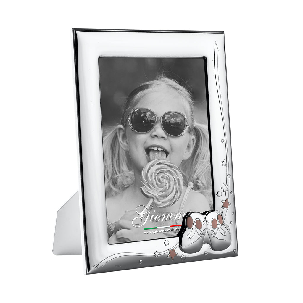 Cornice da tavolo bimbi in metallo argentato retro con piedino in legno. La cornice viene consegnata con sacchetto di protezione certificato di gar...