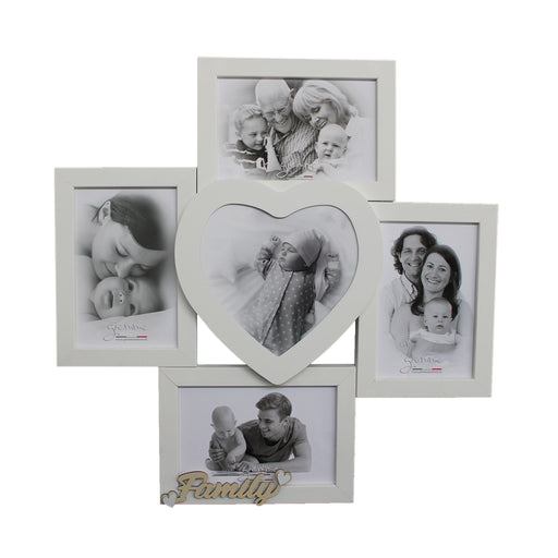 Visualizza tutti i dettagliCornice legno bianco, la cornice da parete, con cuore centrale dedicato alla Famiglia Multifoto formato per 4 foto -10X15 e 1-15x15, con scritta f...