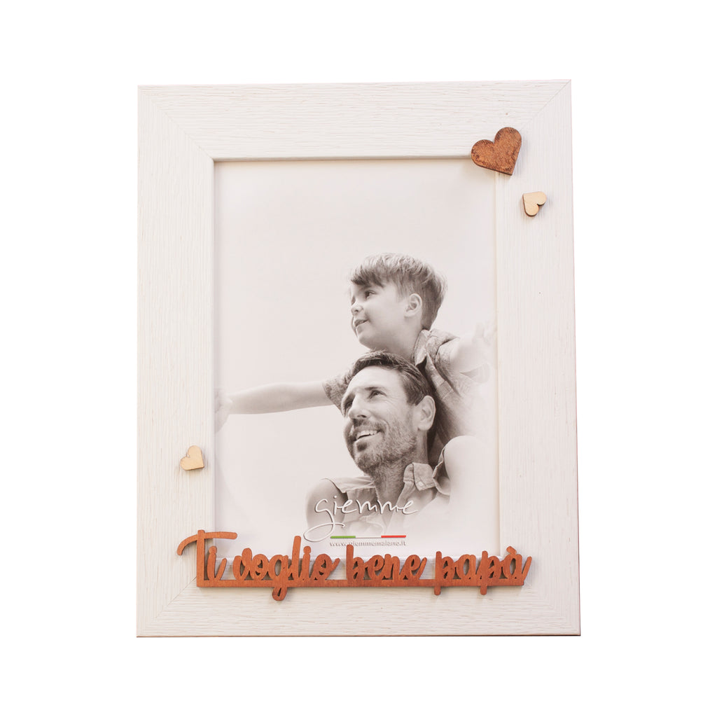 Porta foto legno bianco con applicazioni in legno, retro in legno e vellutino nero.